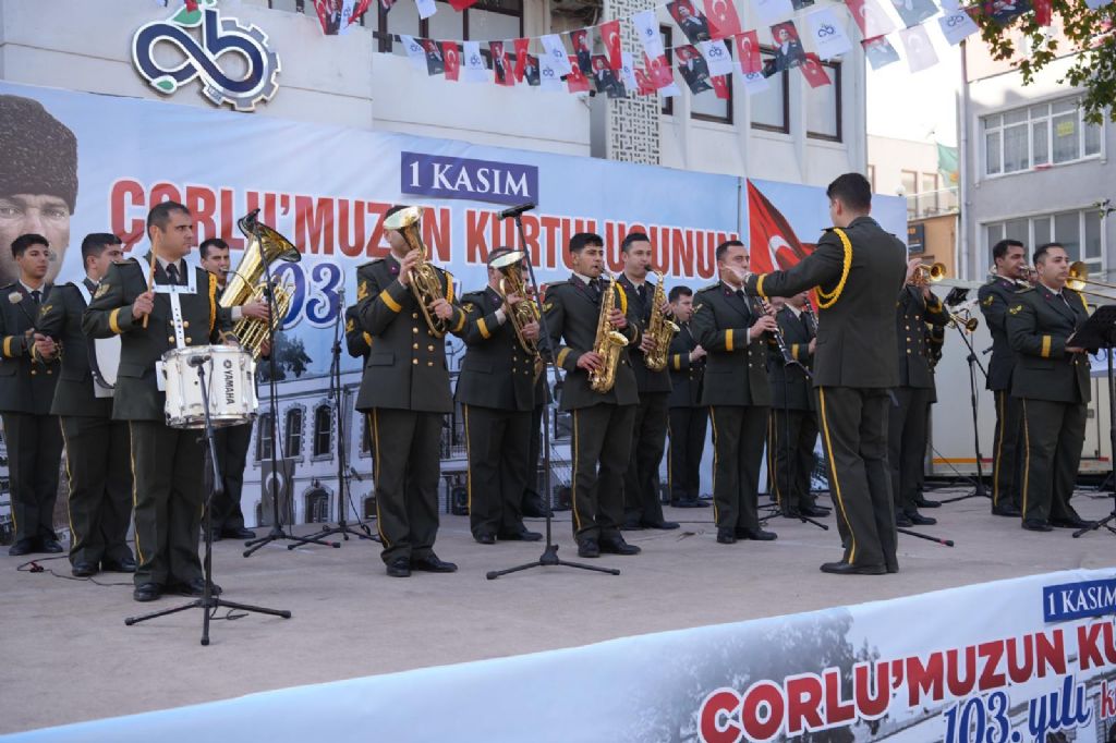 Çorlu Halk Eğitimi Merkezi Halk Oyunları ekibi, yöresel gösterilerini sunarken 5. Kolordu Komutanlığı Bölge Bando Komutanlığı da mini bir konserle kutlamalara renk kattı.