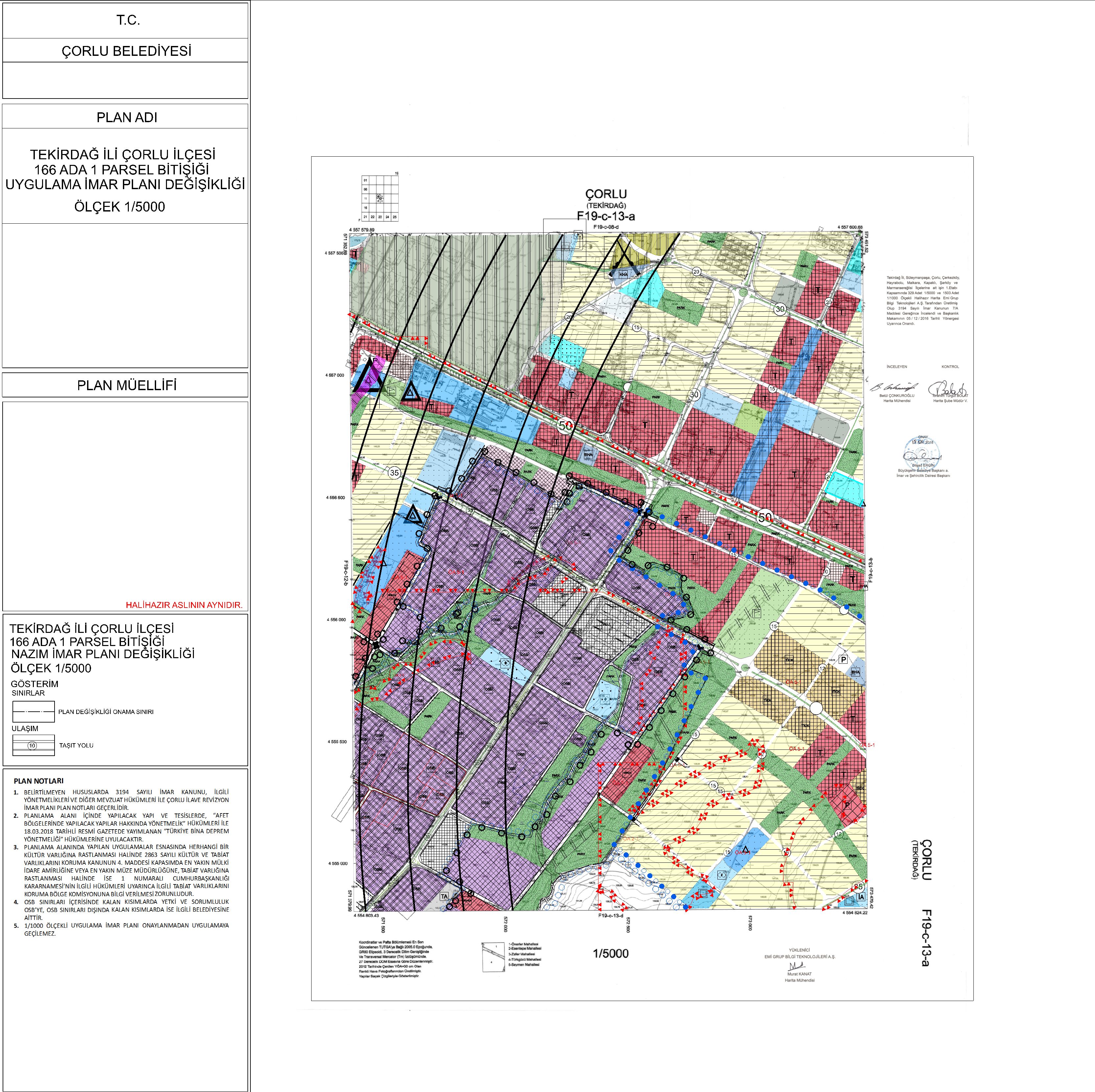 İlçemiz Türkgücü Mahallesi 166 ada 1 numaralı parselin kuzeyine ilişkin hazırlanan 1/5000 Ölçekli Nazım İmar Planı değişikliği teklifi, Çorlu Belediye Meclisi’nin 03.09.2025 tarih ve 2025/181 sayılı kararı ile; Tekirdağ Büyükşehir Belediye Meclisi’nin 14.01.2026 tarih ve 99 sayılı kararınca onaylanmıştır. Söz konusu İmar Planı değişikliği, Mekânsal Planlar Yapım Yönetmeliği'nin 33. maddesi gereğince 03.02.2026 tarihi 1.gün olmak üzere plan değişikliğine ait plan açıklama raporuna aşağıdaki "Dökümanlar" kısmından ulaşabilirsiniz.