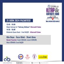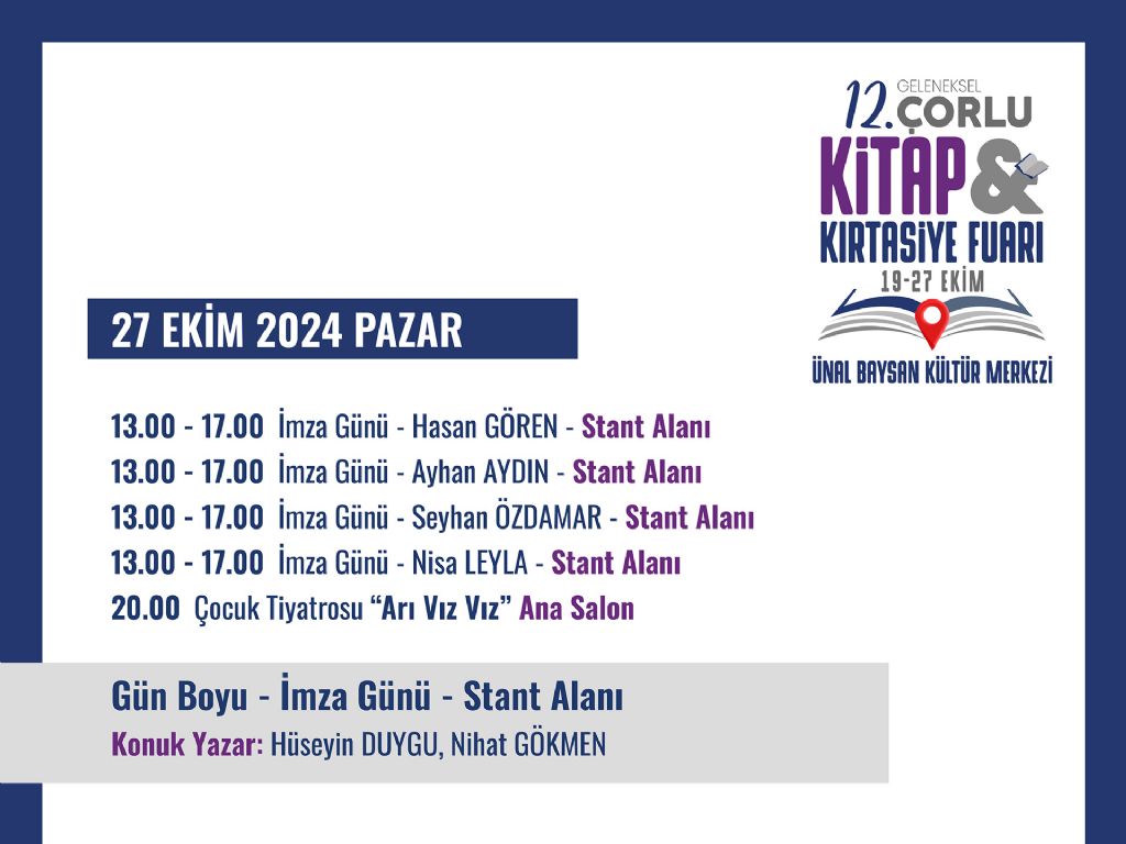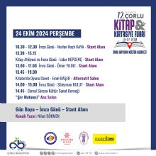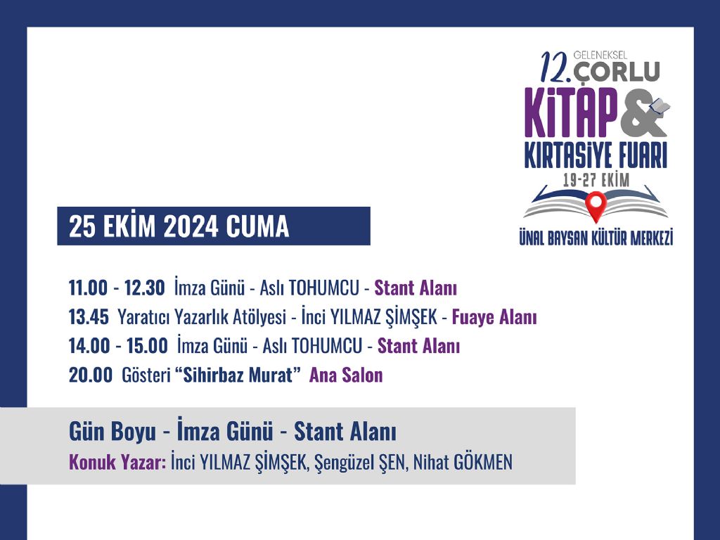 19 Ekim 2024 Cumartesi günü saat 15.00’te açılarak 27 Ekim 2024 Pazar günü sona erecek olan 12. Geleneksel Çorlu Kitap ve Kırtasiye Fuarı programı ise şöyle: